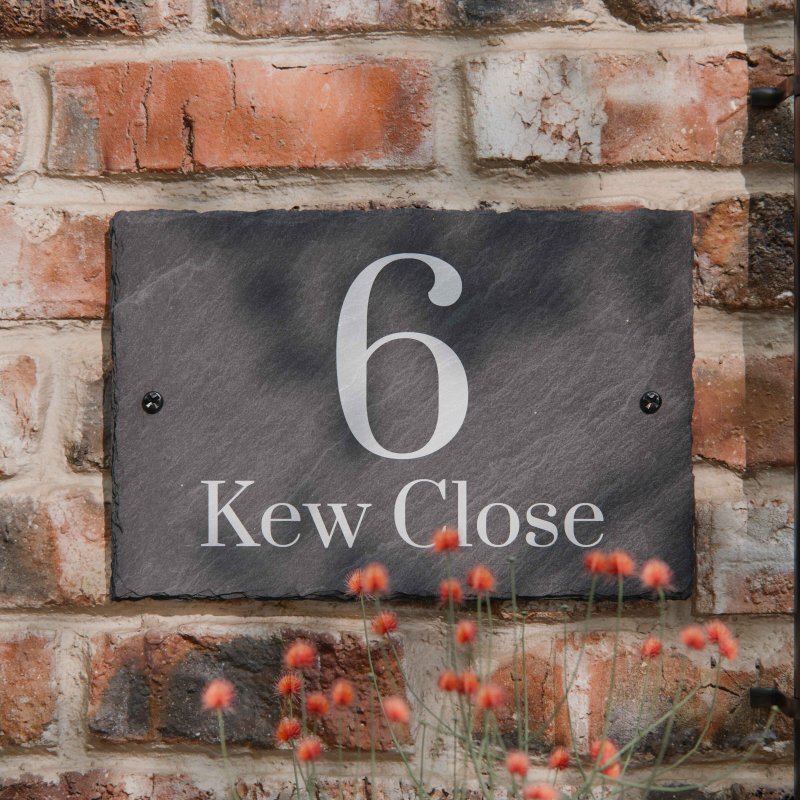 Please note: Due to the material, the slate panel and drill holes may be misaligned by a few millimetres due to the edges not being completely square. No two pieces of slate are identical, differences in surface appearance may occur. For our deep-engraved slate house signs, the presence of pyrite may create subtle bumps, rendering a distinctively natural and textured rather than a completely smooth finish.